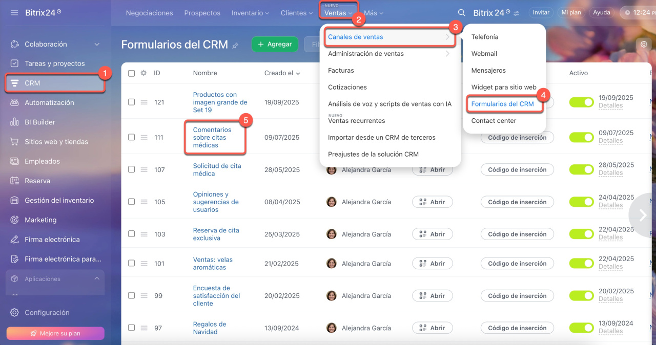 1-5. Ve a la sección de CRM > Ventas > Canales de ventas > Formularios del CRM y abre el formulario requerido.