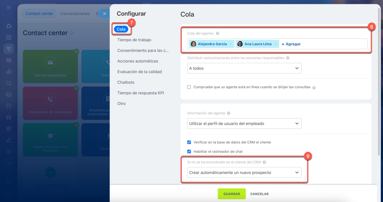 7-9. En la pestaña Cola, define los empleados que recibirán los mensajes y ajusta las configuraciones de creación de prospectos.