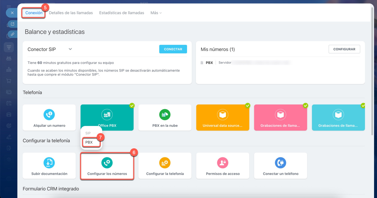 5-7. En la pestaña Conexión, haz clic en Configurar los números y selecciona un número alquilado o una PBX.