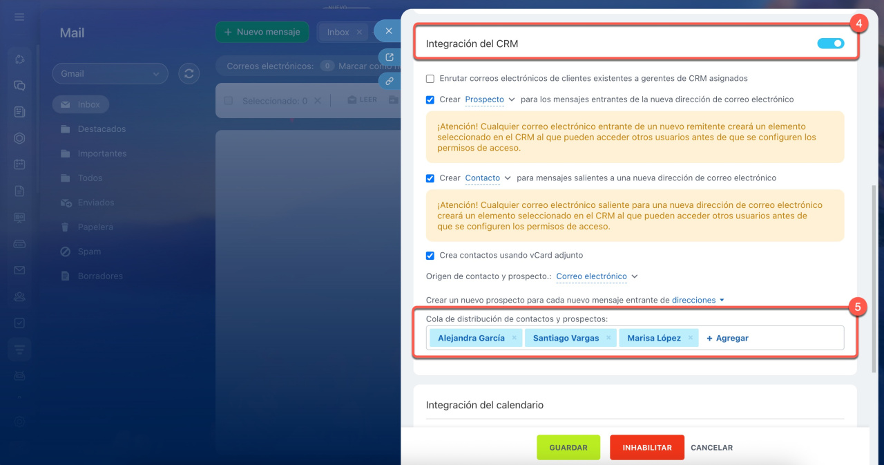 4-5. En el bloque de Integración del CRM, busca el campo Cola de distribución de contactos y prospectos y añade a los empleados que trabajarán con nuevos prospectos.