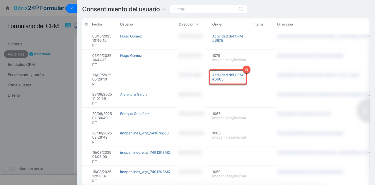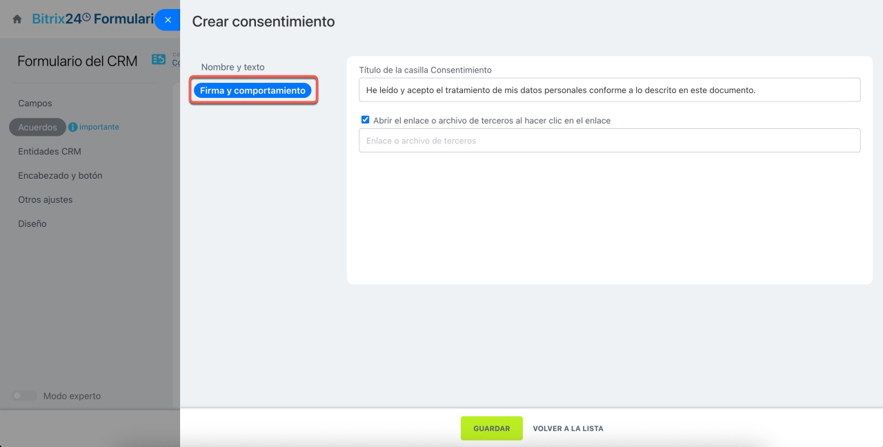 Puedes acceder a la lista de consentimientos desde la configuración del formulario del CRM.