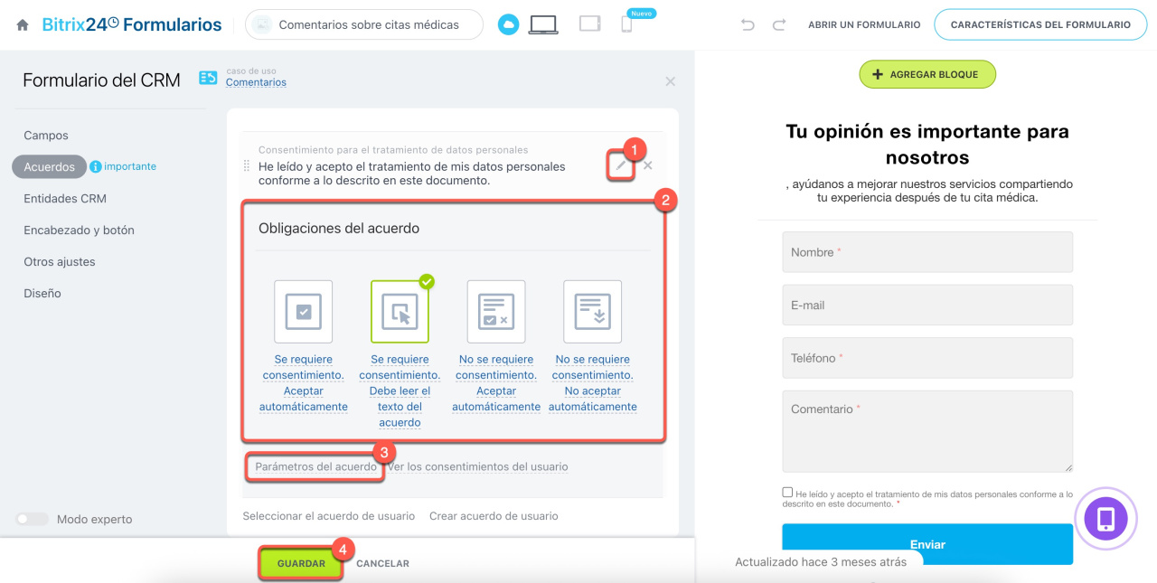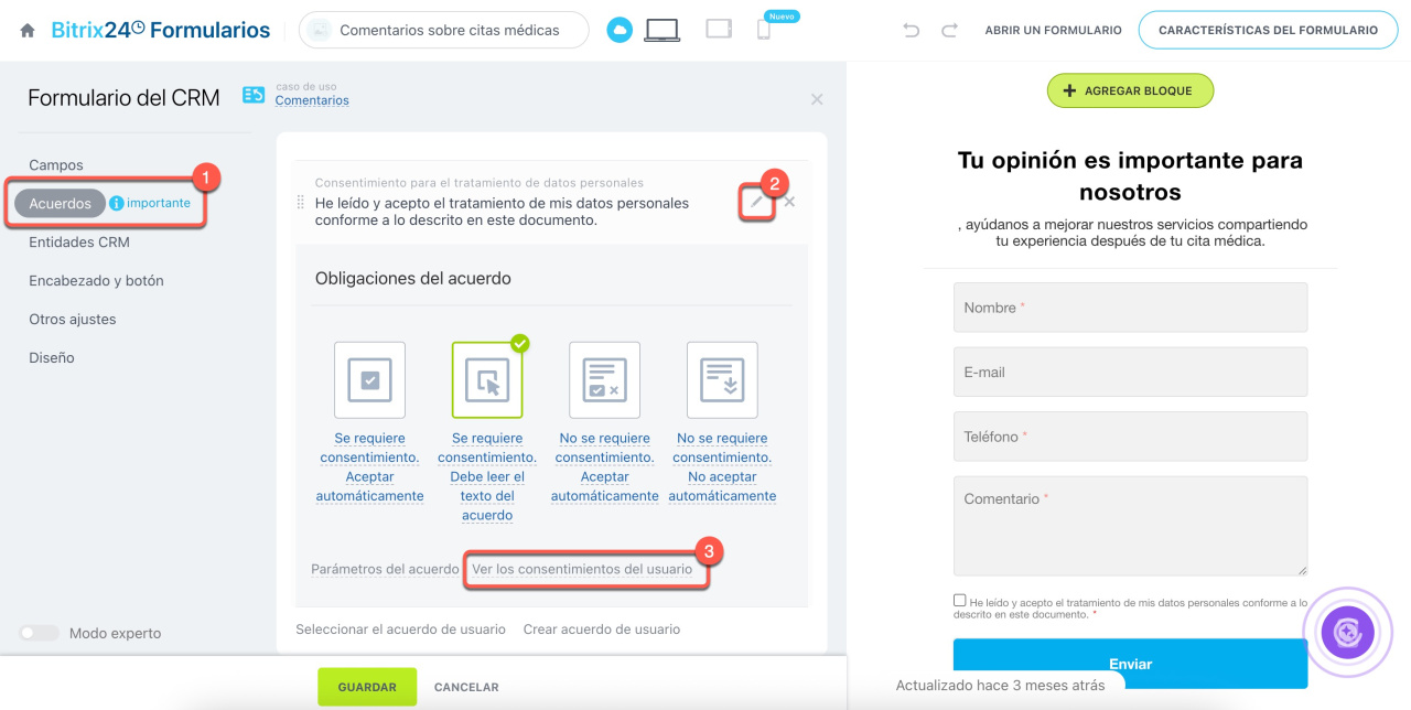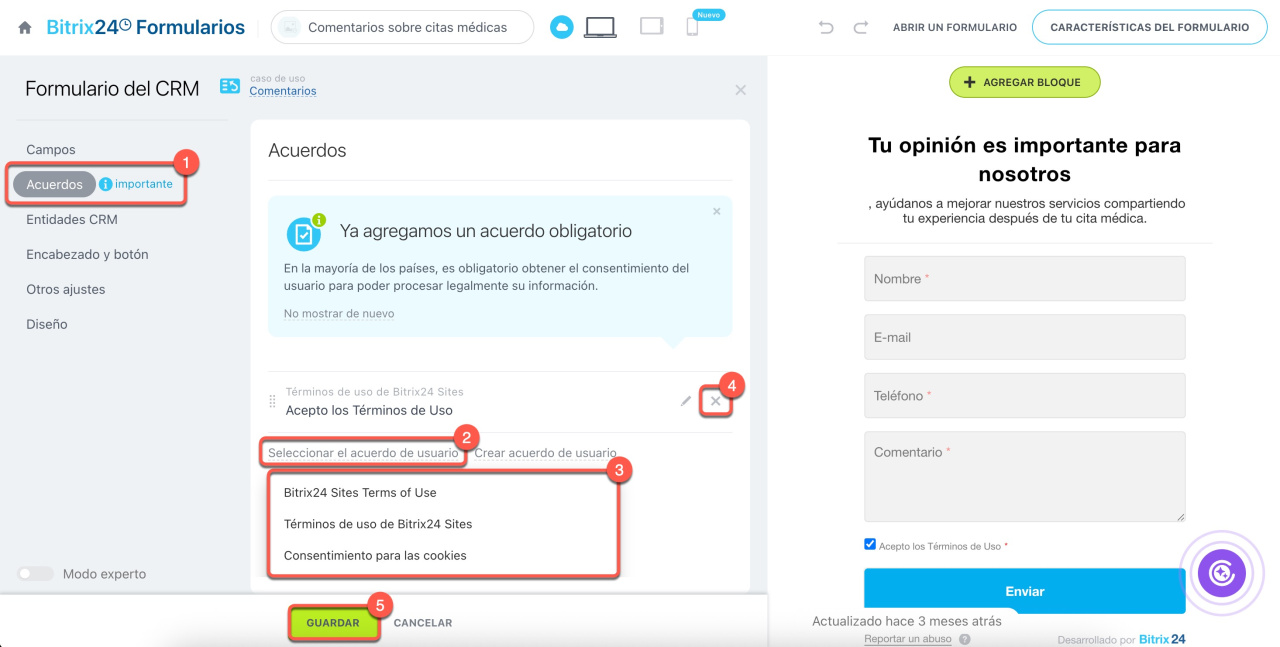 - Los formularios del CRM de Bitrix24 te permiten recopilar consentimientos de usuarios para cumplir con la normativa legal y proteger sus intereses.