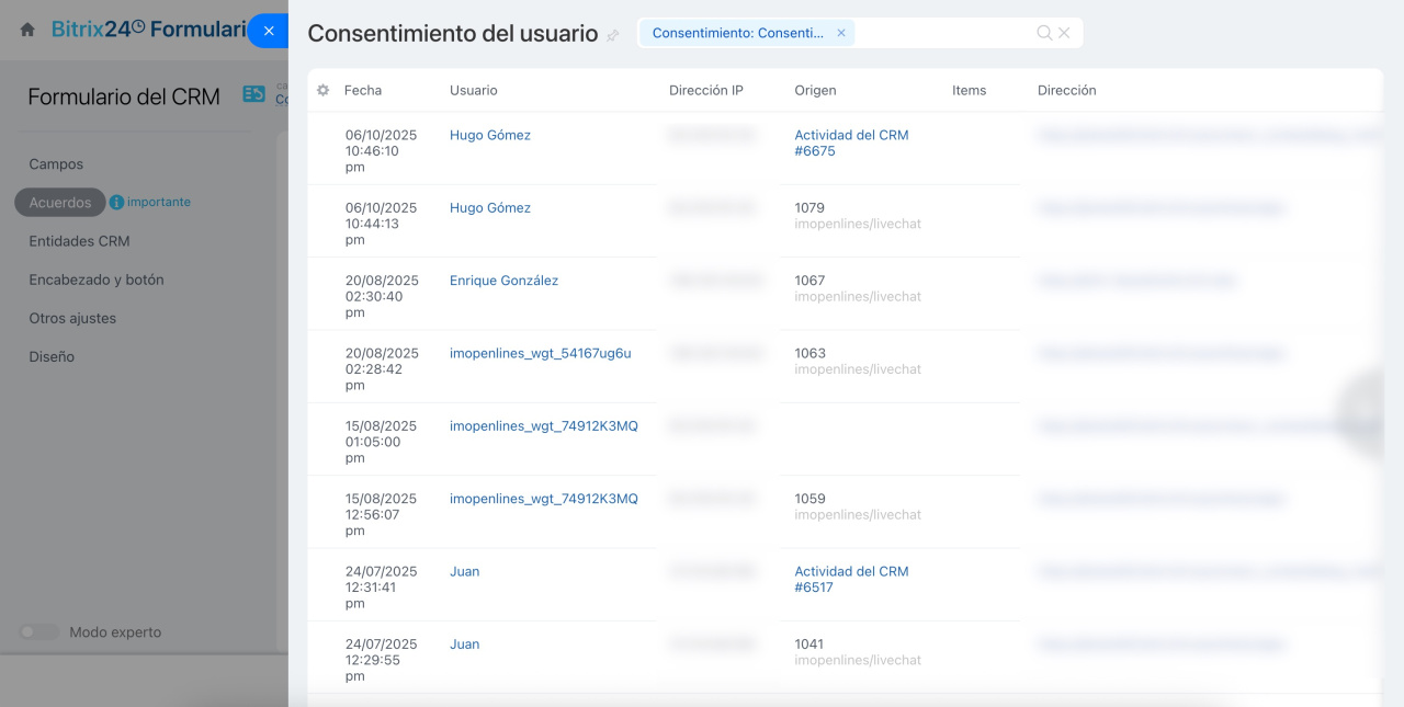 - Los consentimientos se almacenan en el CRM en una lista independiente, que incluye la fecha, IP del cliente, fuente y página donde se confirmó el consentimiento.