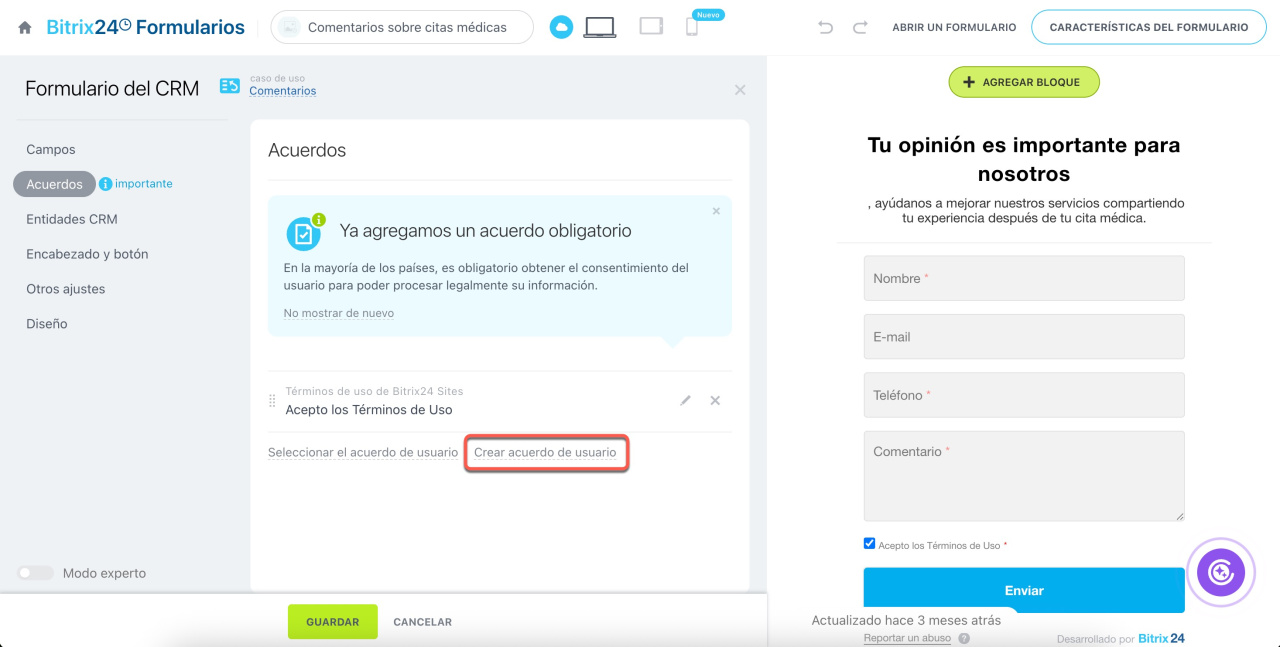 Puedes añadir diferentes acuerdos al formulario para informar a los clientes sobre términos de entrega, reglas de promociones y otros detalles importantes. Una vez que el cliente lea el texto y confirme su consentimiento, esta información junto con los datos del formulario se guardan en el CRM.