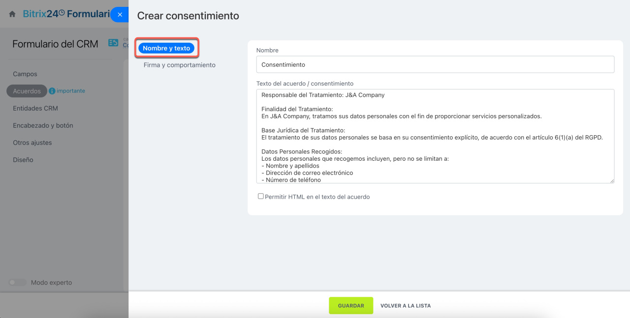Texto del acuerdo / consentimiento: el texto se puede crear desde cero y formatear con código HTML, lo que permite resaltar encabezados, agregar enlaces, etc. Para garantizar que el texto con formato se muestre correctamente, habilita la opción Permitir HTML en el texto del acuerdo.