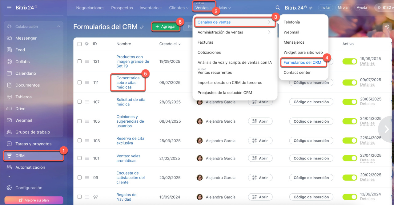 1-4. Ve a la sección de CRM > Ventas > Canales de ventas > Formularios del CRM.