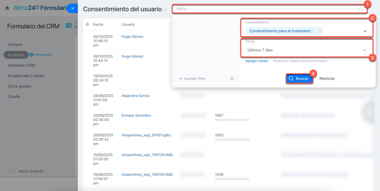 1-2. Haz clic en Filtrar y especifica el acuerdo requerido en el campo Consentimiento.