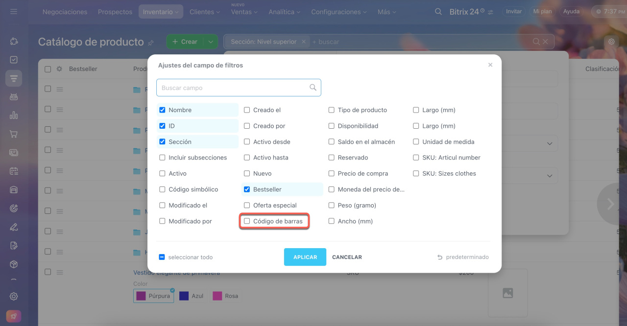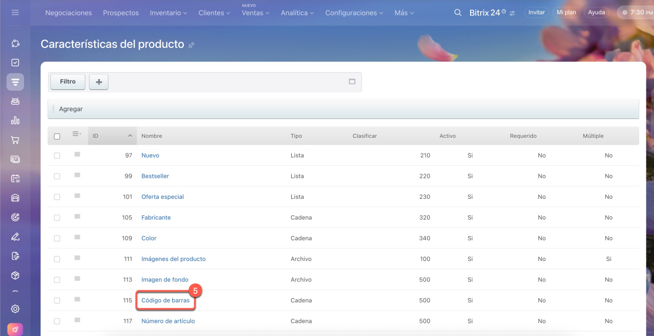 Si falta un campo necesario, agrégalo en la configuración de propiedades del producto. Esto puede hacerlo el administrador de Bitrix24 o del CRM.