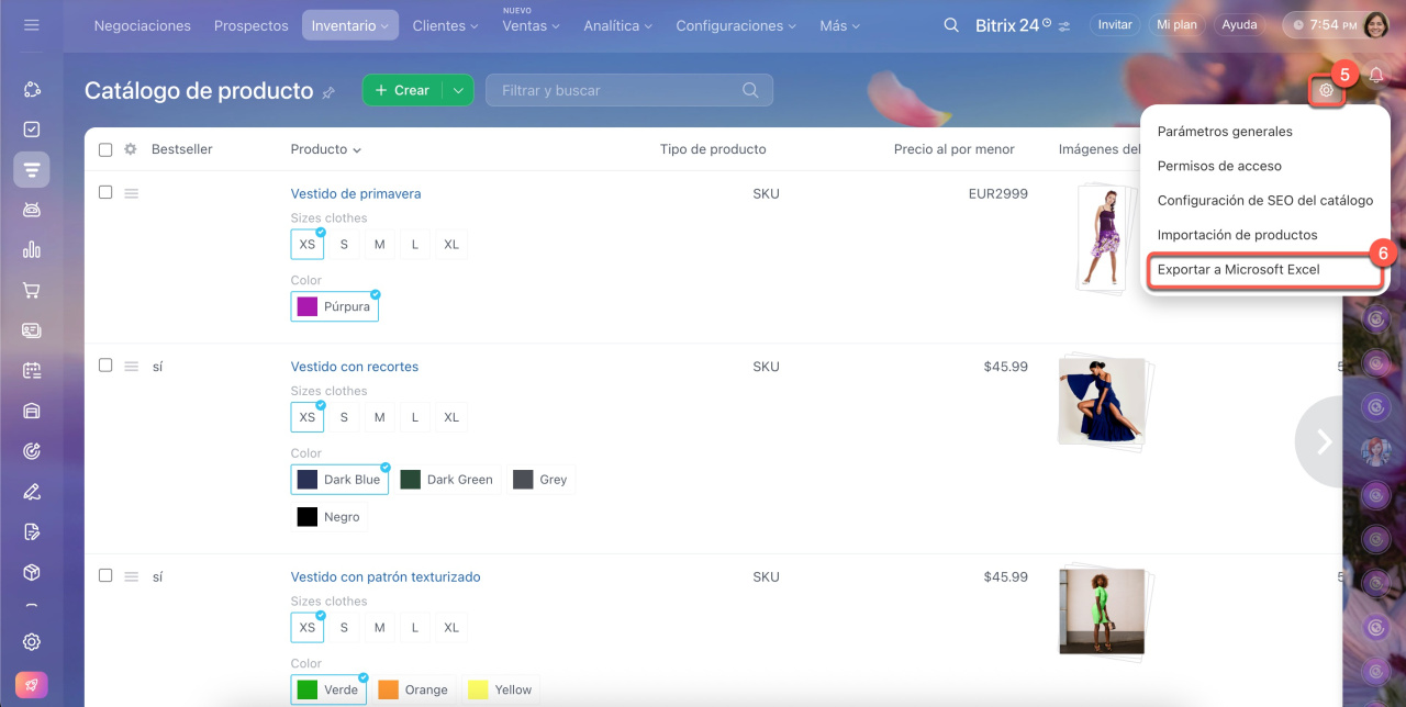 - Los productos y servicios pueden importarse y exportarse. Sube una lista existente a Bitrix24 o exporta el catálogo a Microsoft Excel para actualizar precios o preparar una lista de precios.