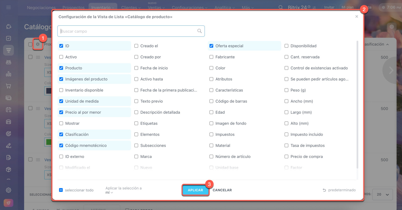 Personaliza la lista de productos y servicios según tus necesidades mostrando solo los parámetros necesarios. Haz clic en Configuración (⚙️), selecciona las columnas que deseas mostrar y haz clic en Aplicar. Por ejemplo, puedes mostrar SKU, niveles de inventario y fabricante si necesitas comparar características rápidamente.