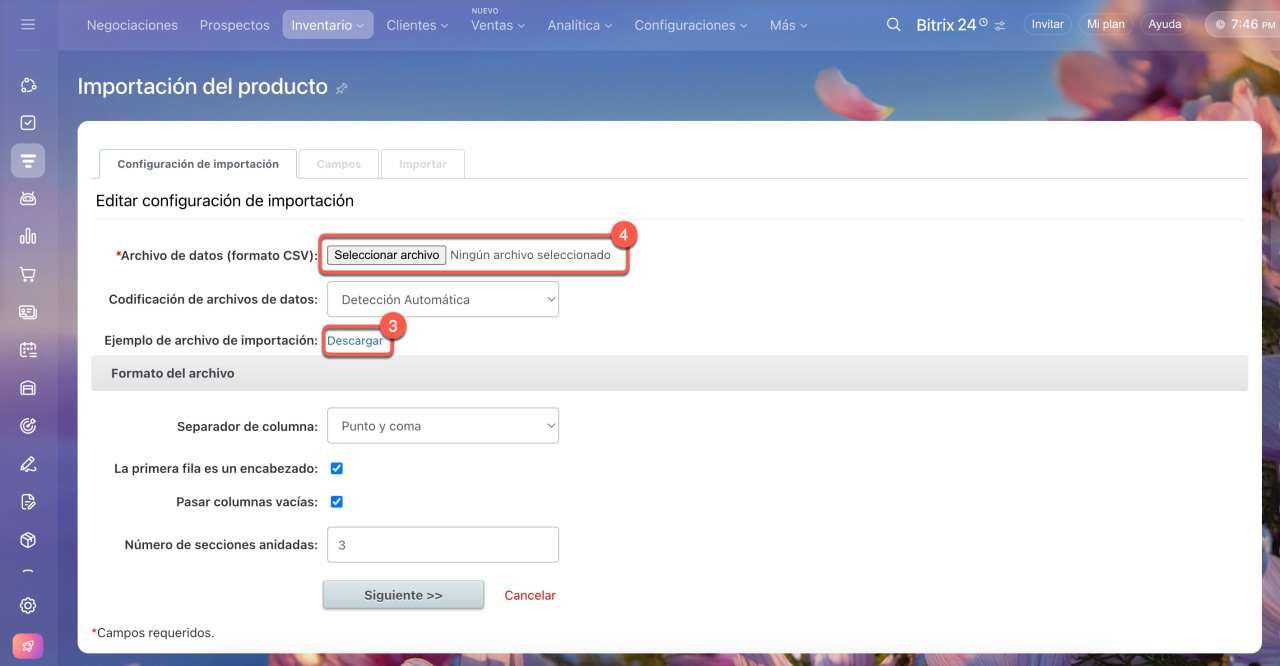 4. Sube el archivo de importación a Bitrix24 y verifica la correspondencia de los campos.