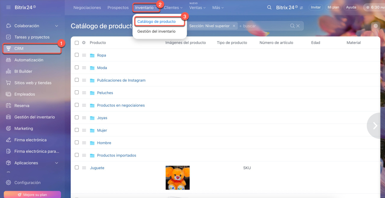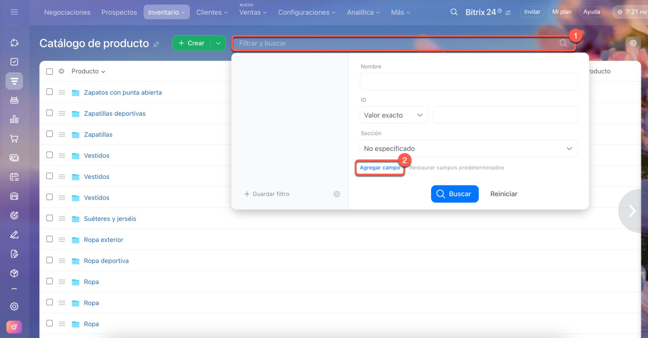 Para acceder al catálogo, ve a la sección de CRM > Inventario > Catálogo de productos.