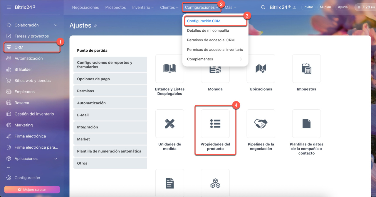 1-4. Ve a la sección de CRM > Configuraciones > Configuración CRM > Propiedades del producto.