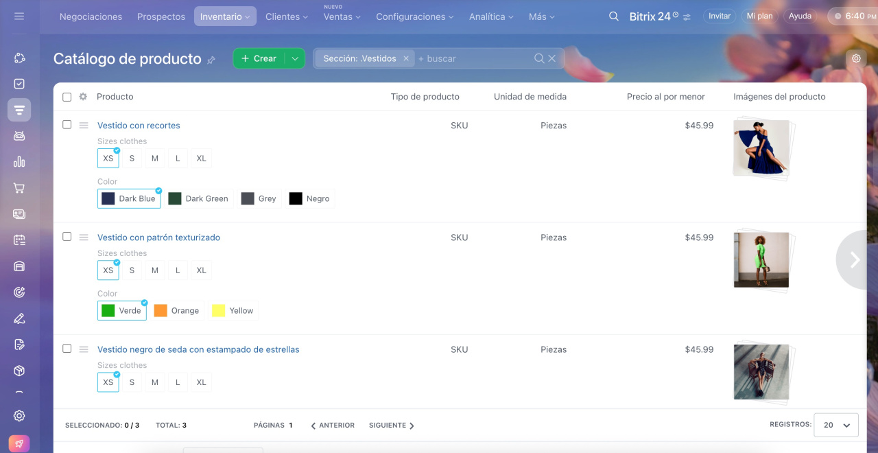 Bitrix24 ofrece un catálogo de productos unificado para el CRM y las tiendas online. Si conectas una tienda online, los productos del catálogo aparecerán automáticamente en el sitio web.