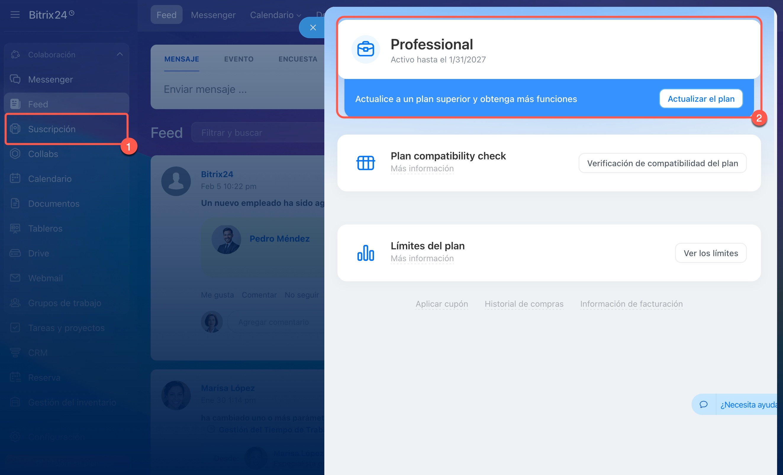 Puedes actualizar o cambiar tu plan de suscripción a cualquier otro plan directamente desde tu cuenta de Bitrix24, ya sea a través de la sección Suscripción o mediante el widget Mi plan.