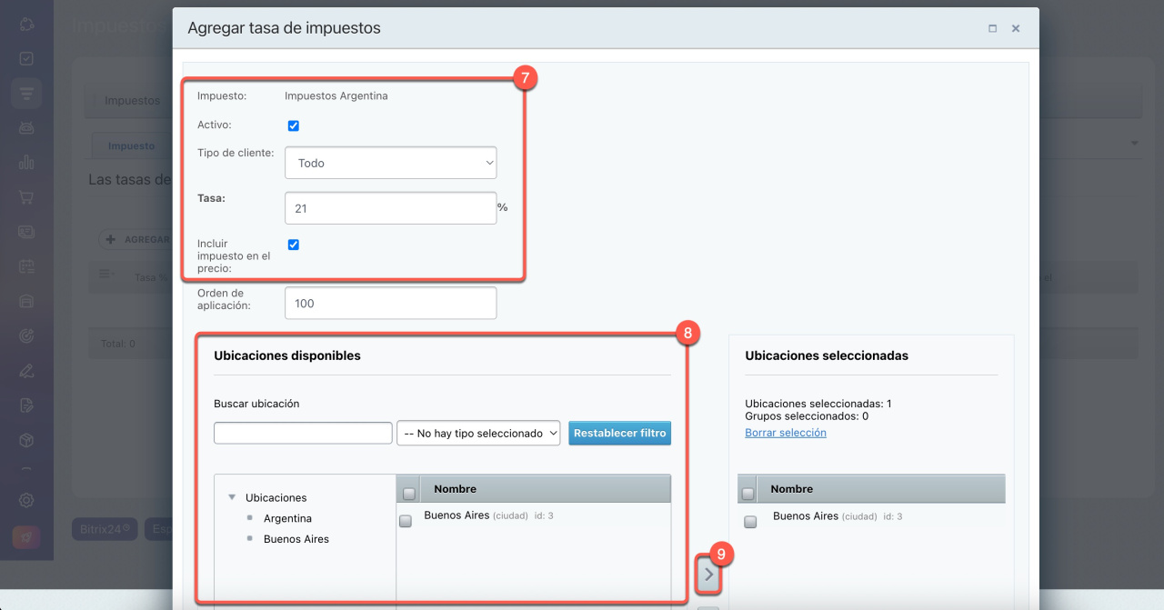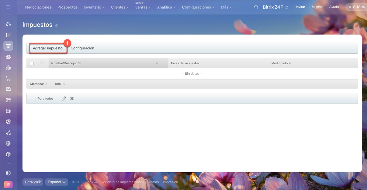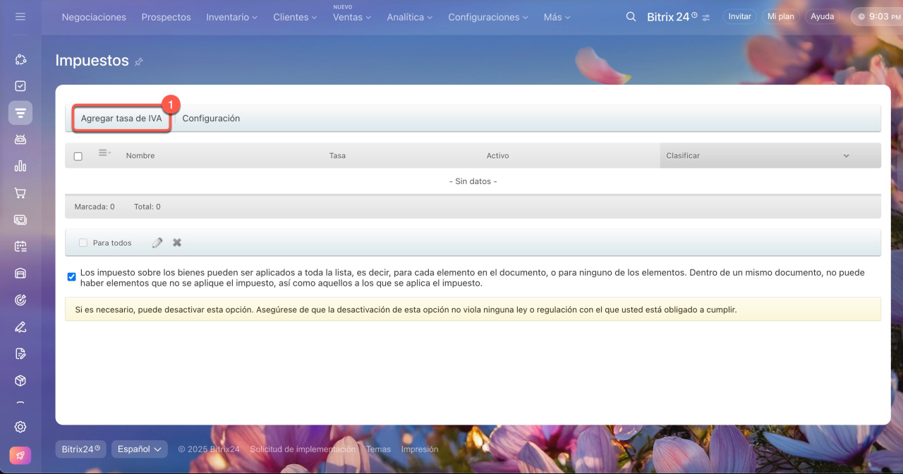 - Configura las tasas en la sección de CRM > Configuraciones > Configuración CRM > Impuestos.