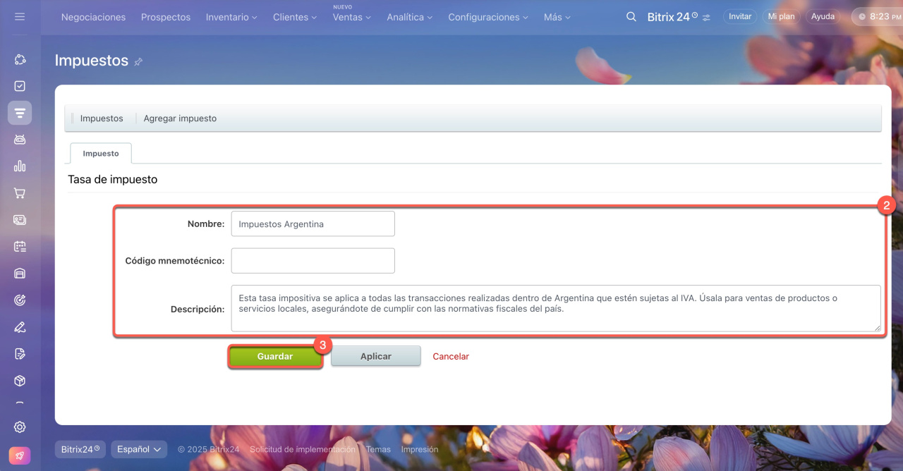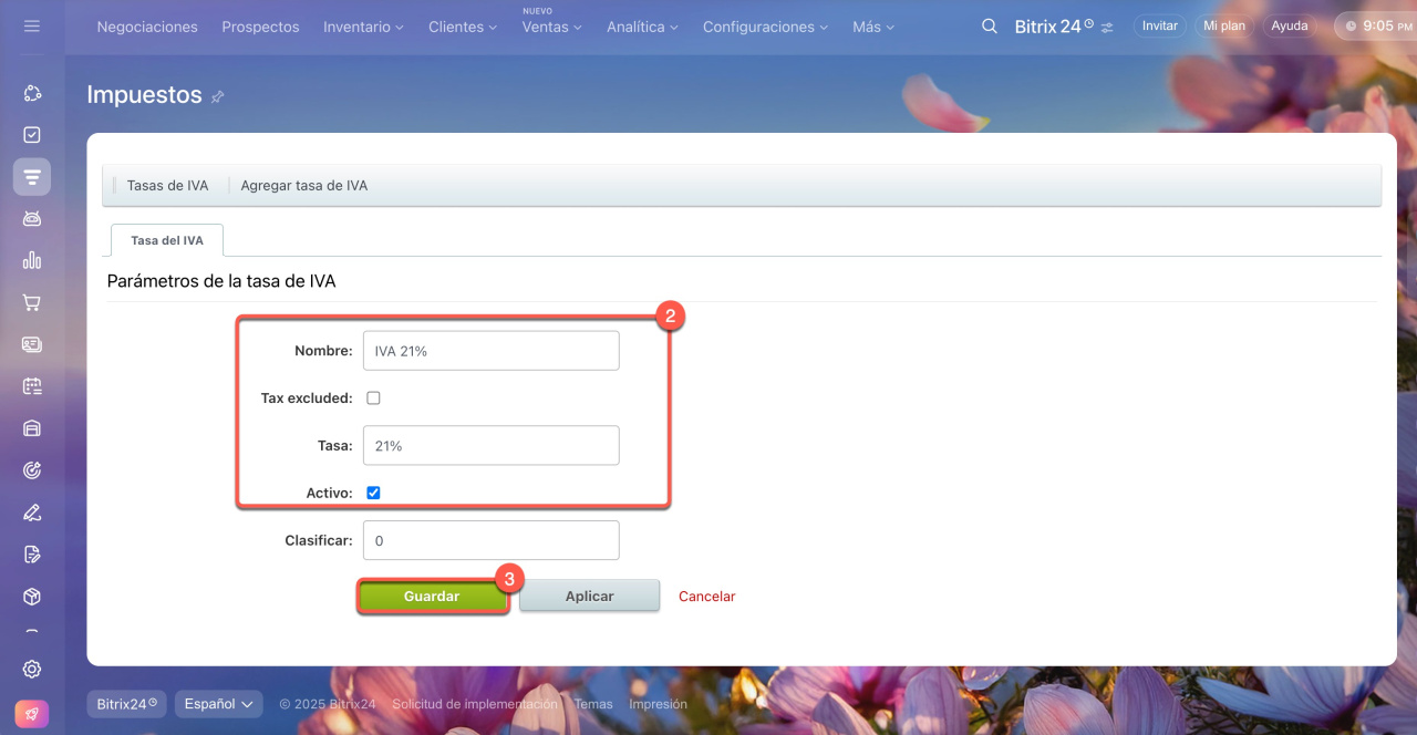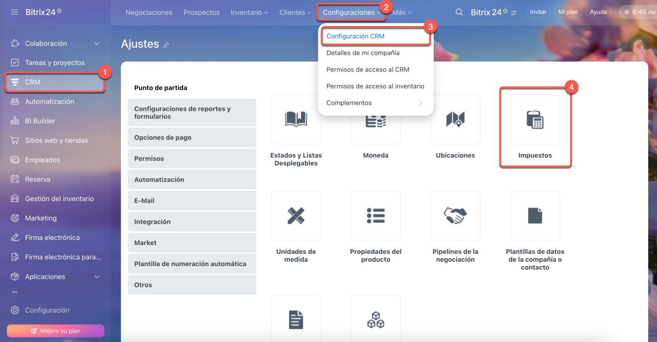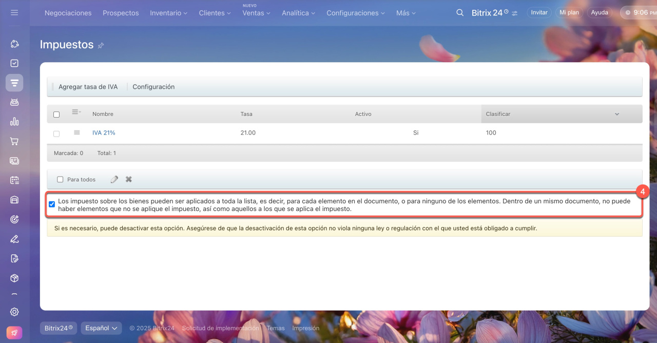 - En Bitrix24 puedes configurar tasas de impuestos para productos y servicios, aplicándolos automáticamente a documentos, facturas y negociaciones.