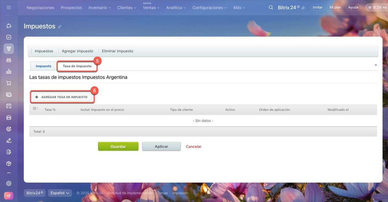 5-6. Ve a la pestaña Tasa de impuesto y haz clic en Agregar tasa de impuesto.