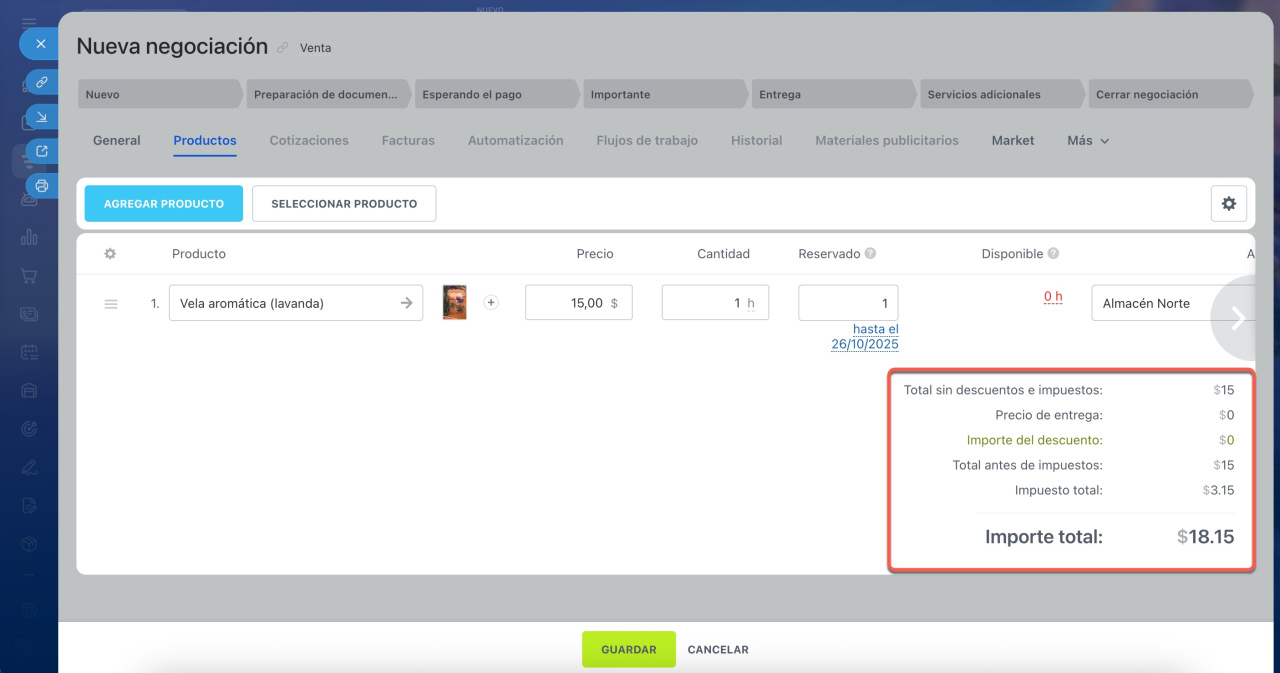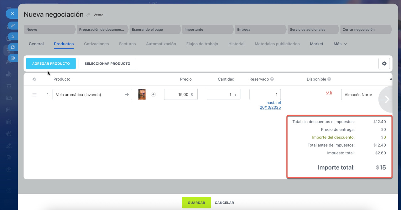 Ubicaciones en CRM - Impuesto por artículo (IVA): este impuesto se especifica y aplica de forma individual a cada producto.