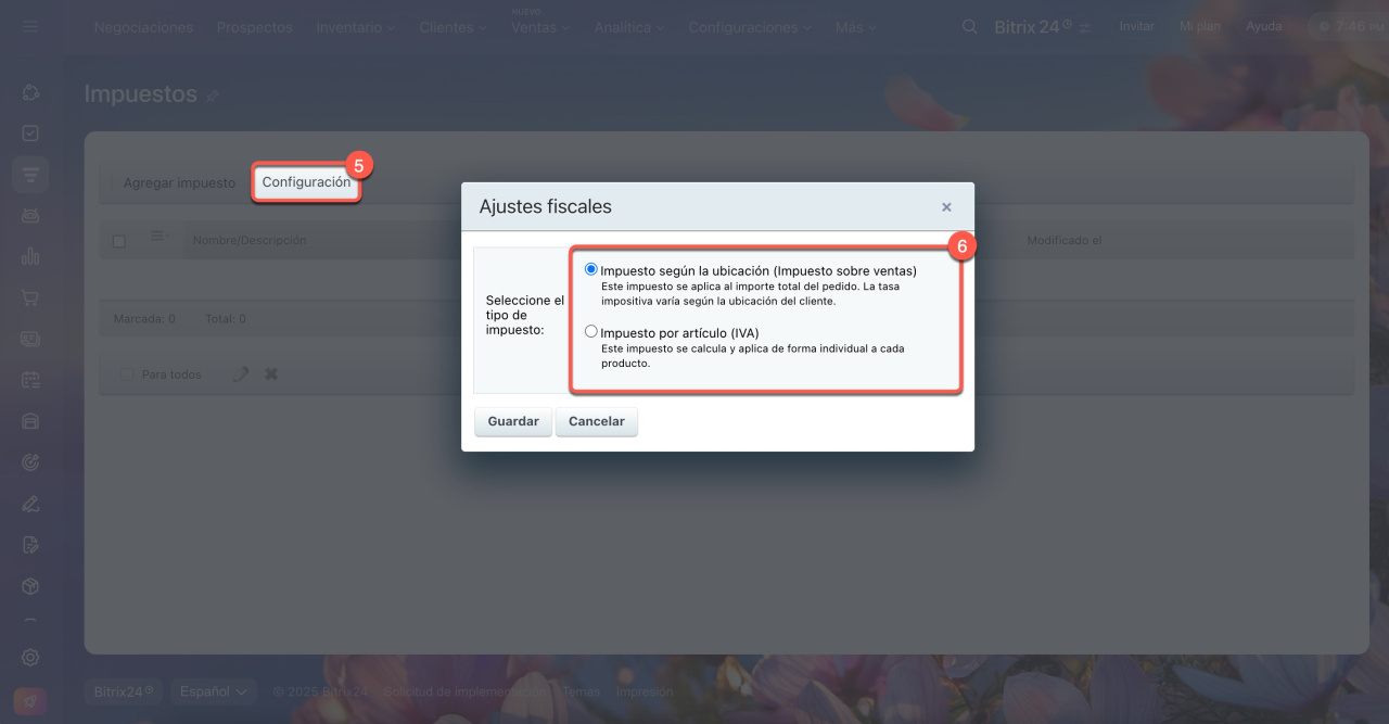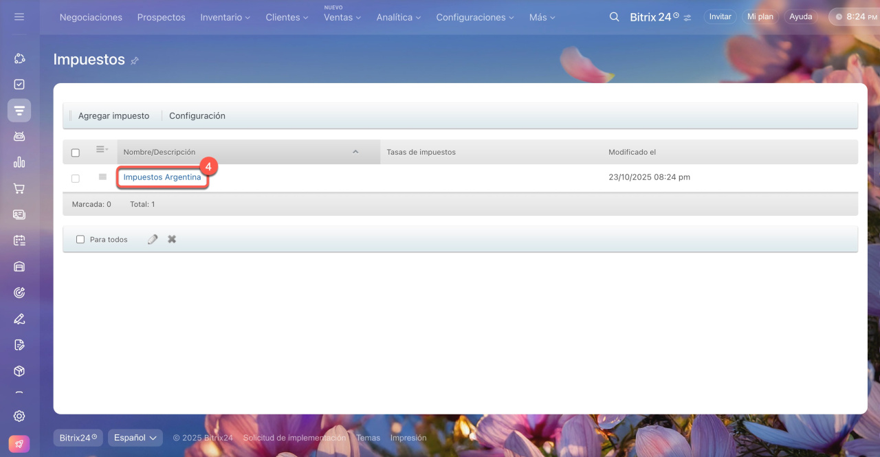 Ve a la sección de CRM > Configuraciones > Configuración CRM > Impuestos. Haz clic en Configuración y selecciona un tipo de impuesto:
