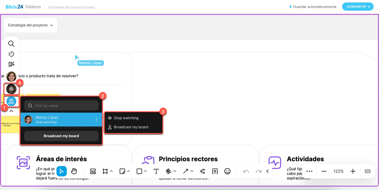 - Observar (Watch): tu vista del tablero seguirá automáticamente al usuario seleccionado, moviéndose a su área de trabajo y ajustando el zoom.