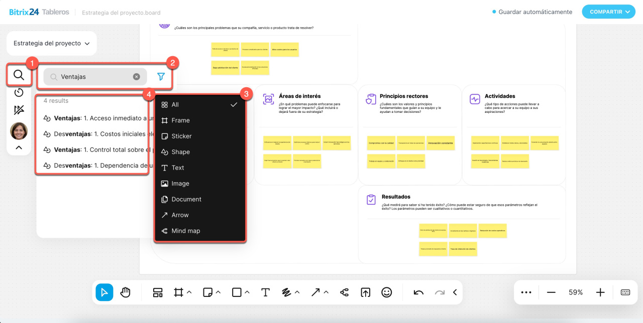 . Te permite encontrar rápidamente en el tablero cualquier objeto mediante palabras clave o filtrando por tipo de elemento.