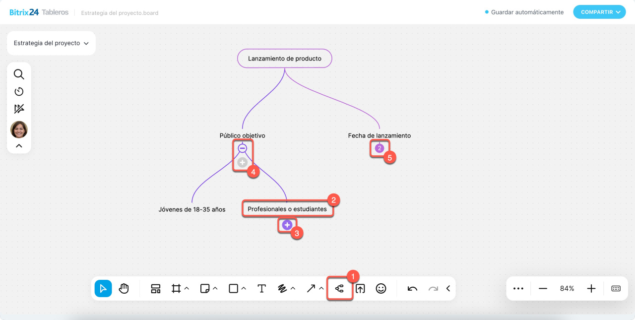 - Todos los cambios se guardan automáticamente y los participantes ven las actualizaciones en directo, pudiendo comentar directamente en el tablero.