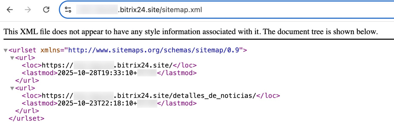 Mapa del sitio web. Es un archivo especial que contiene enlaces a todas las páginas del sitio web. Los motores de búsqueda lo utilizan para encontrar e indexar el contenido rápidamente. En Bitrix24, el mapa del sitio web se genera automáticamente y se actualiza con cada cambio, por lo que las nuevas secciones y productos aparecen en los resultados sin demora.
