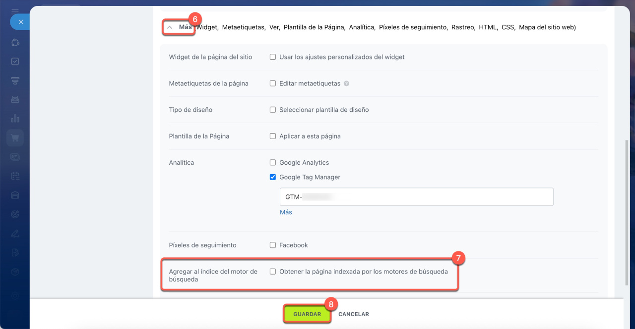 6-7. En la sección Más > Agregar al índice del motor de búsqueda, deshabilita la opción Obtener la página indexada por los motores de búsqueda. Para que la página vuelva a aparecer en los resultados, marca nuevamente la casilla.