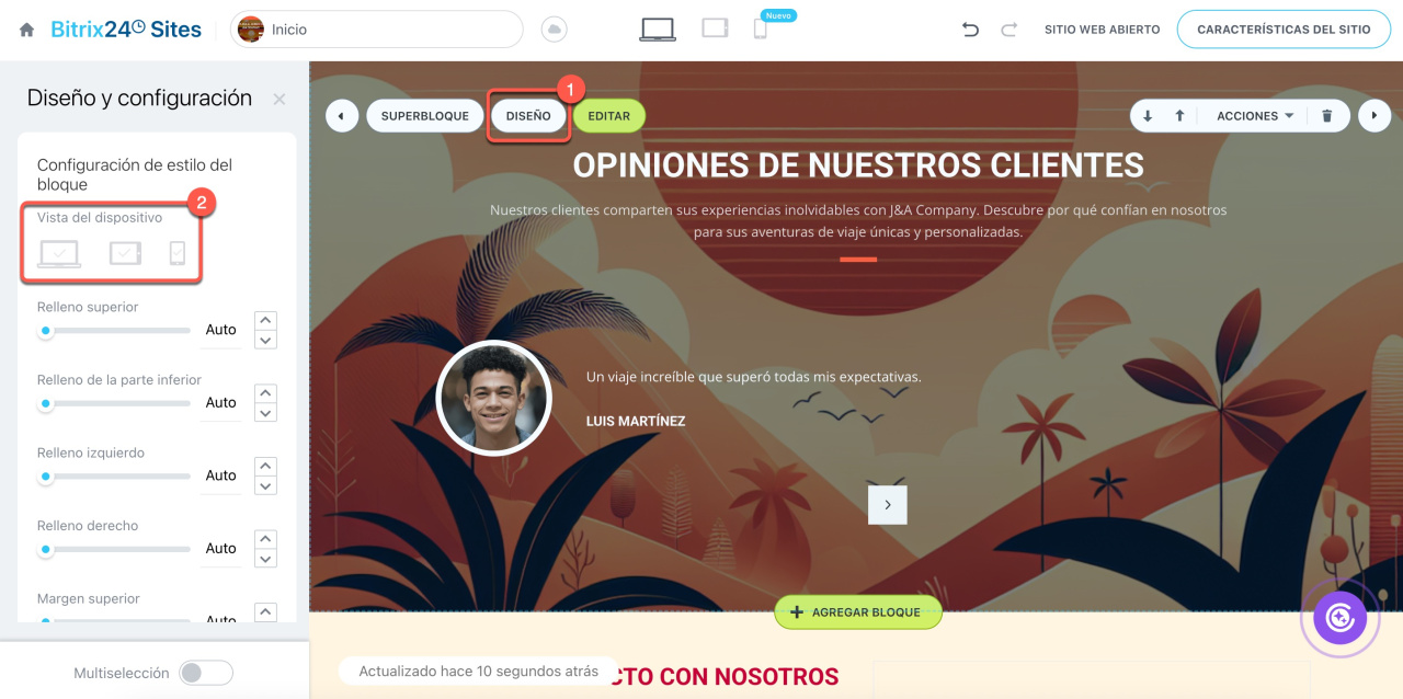 Si un bloque está activo pero no se ve en todos los dispositivos, ajusta su visibilidad. Haz clic en Diseño y selecciona en qué dispositivos quieres que sea visible.