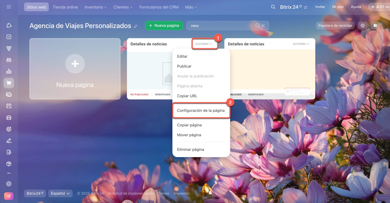 4-5. Encuentra la página deseada y selecciona Acciones > Configuración de la página.