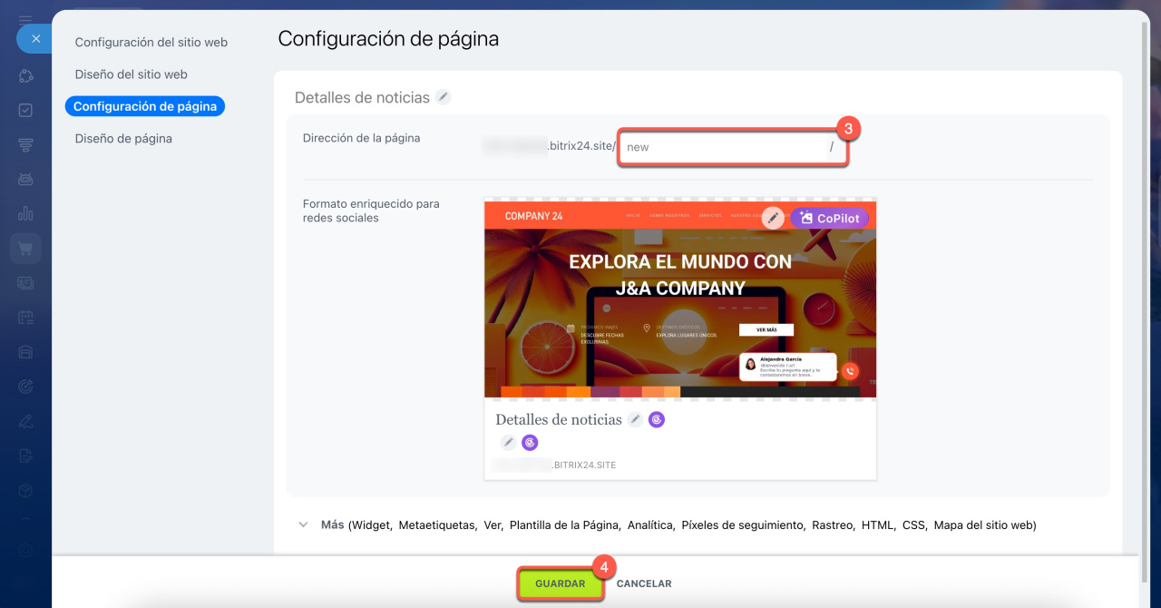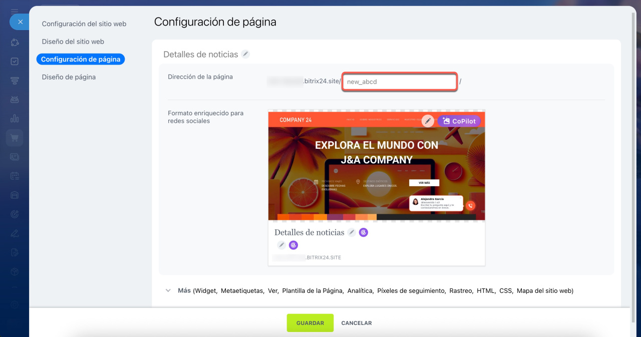Puedes modificar la dirección de una página desde su configuración, pero en ocasiones se añaden caracteres adicionales a la URL que especificas. Por ejemplo, si estableciste /new/, podría quedar como /new_abcd/.