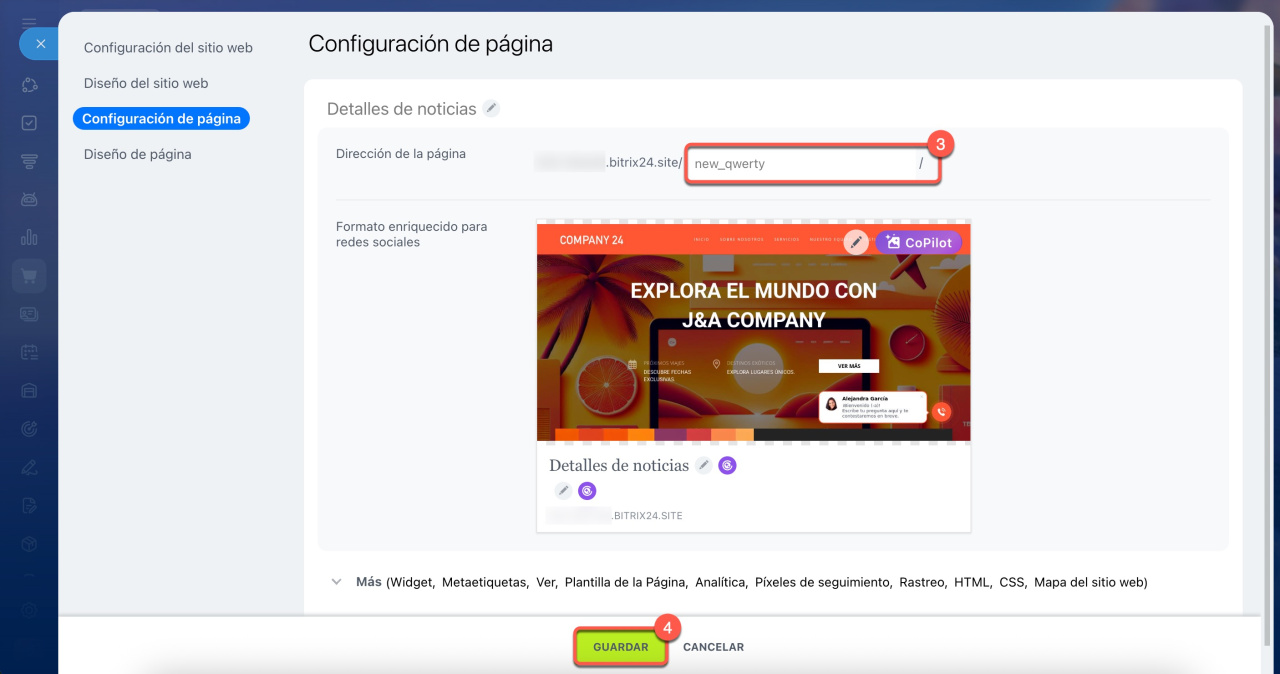 1-4. Haz clic en Acciones > Configuración de la página. Ingresa una nueva URL y guarda los cambios.