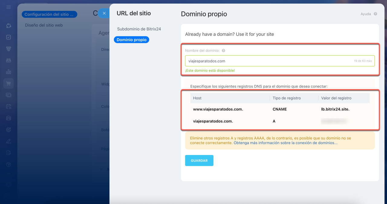 2. En la configuración del sitio web de Bitrix24, introduce tu nuevo dominio. Se mostrarán los registros DNS necesarios.