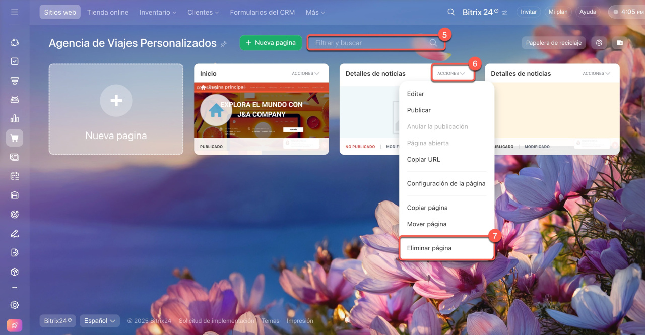 6-7. Busca la página que acabas de restaurar y haz clic en Acciones > Eliminar página para devolverla a la papelera.