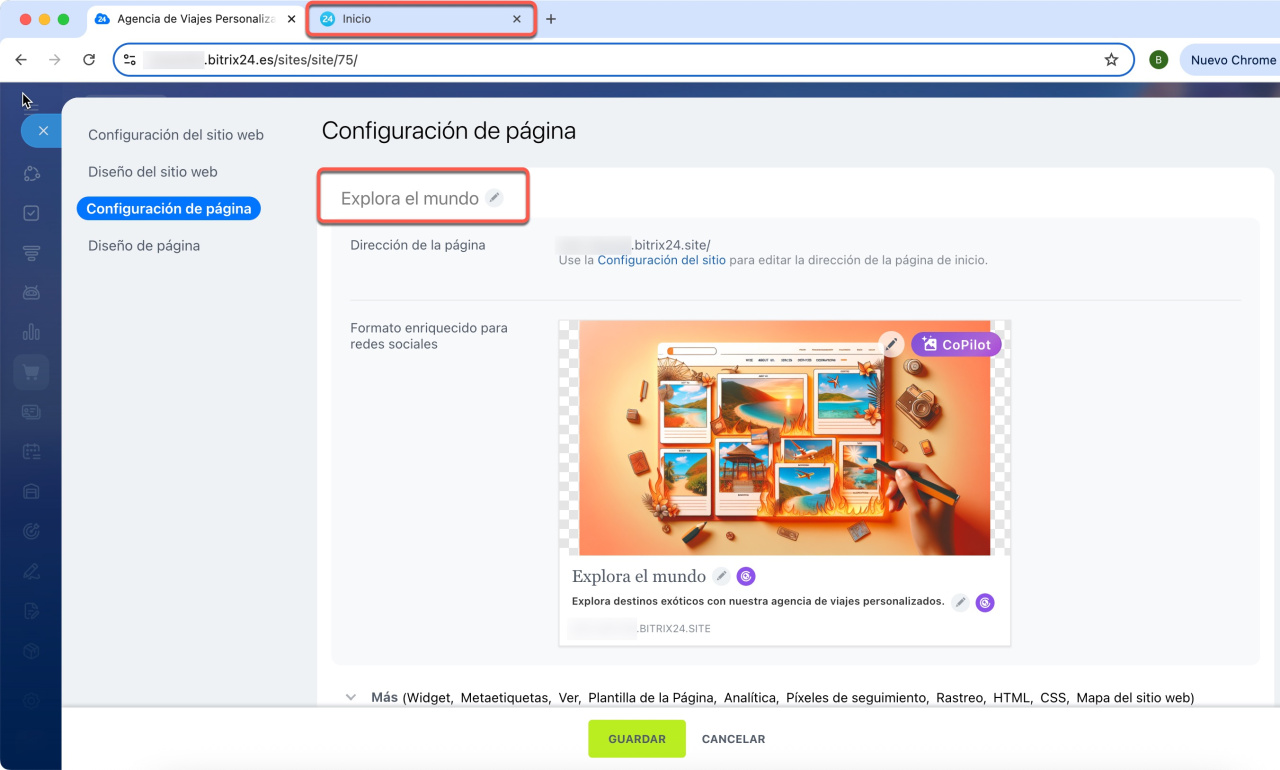 En la configuración de la página puedes especificar el título que aparecerá en la pestaña del navegador. Si ves un título diferente, necesitas ajustar las metaetiquetas de la página, ya que son las que determinan el título que ven los usuarios.