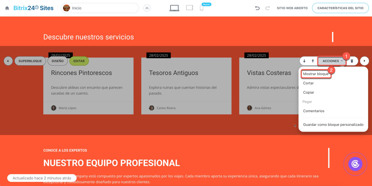 Los bloques ocultos aparecen atenuados y no se pueden editar ni personalizar. Para volver a mostrar un bloque en el sitio web, haz clic en Acciones > Mostrar bloque.