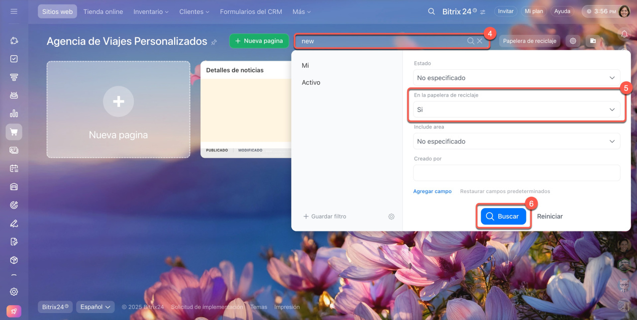5-6. Si no aparece el duplicado, añade un filtro: haz clic en la barra de búsqueda, selecciona Sí en el campo En la papelera de reciclaje y haz clic en Buscar.