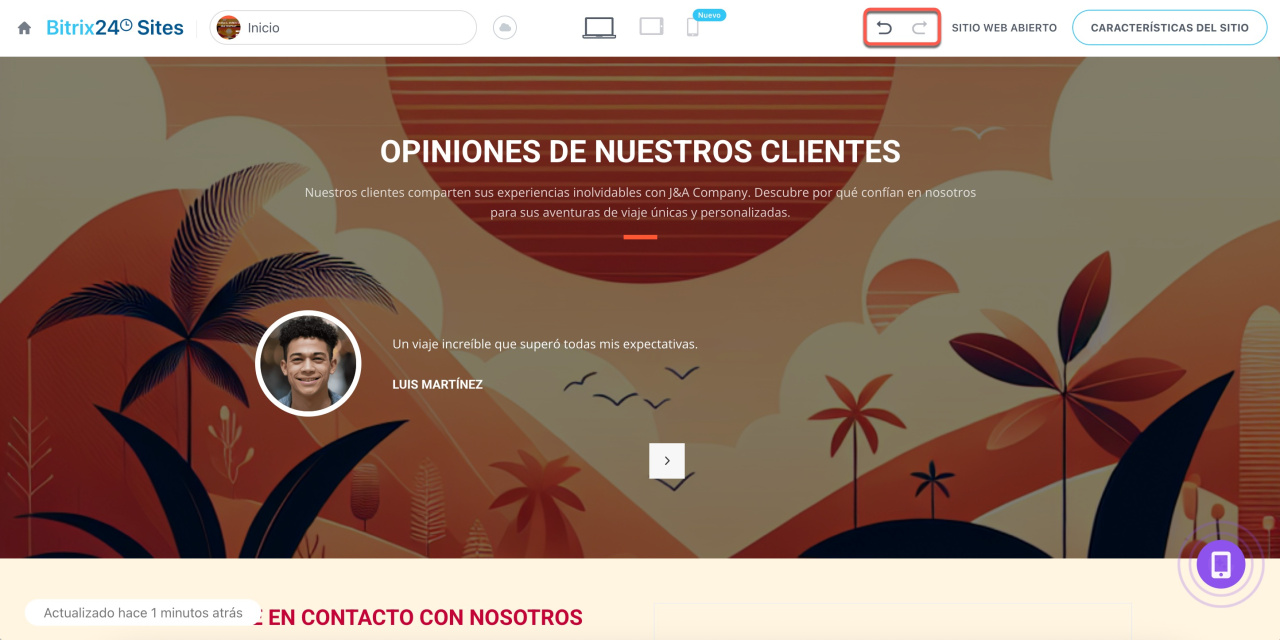 En el editor de sitios web puedes deshacer o rehacer cambios usando los botones de la parte superior de la pantalla. Esto es útil si modificaste accidentalmente la estructura de la página, borraste un bloque o quieres recuperar un diseño anterior.