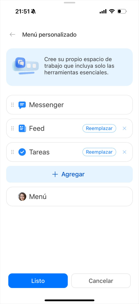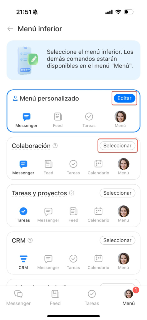 Puedes elegir un menú predeterminado o crear uno personalizado. Por ejemplo, si usas a diario los chats y el Feed, selecciona el menú Colaboración.