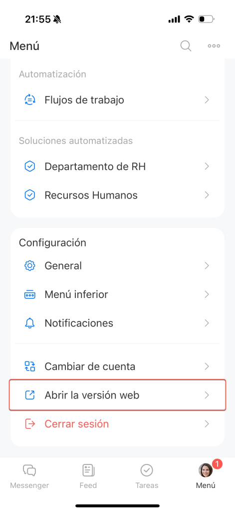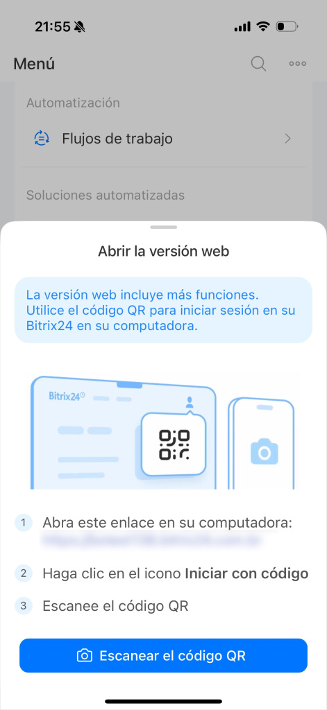Acceder desde el ordenador. Puedes iniciar sesión en Bitrix24 desde tu computadora sin necesidad de introducir usuario y contraseña manualmente. Selecciona Abrir la versión web y escanea el código QR.