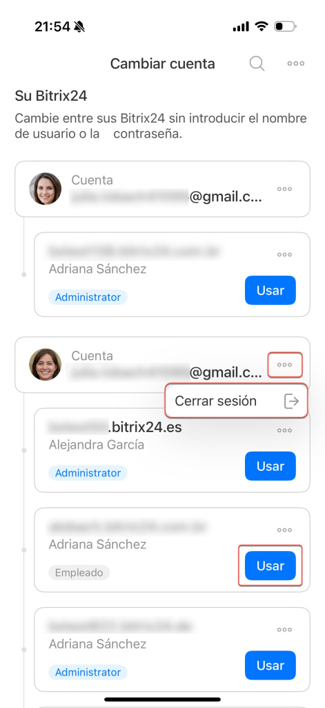 - Cambiar a otra cuenta de Bitrix24 pulsando Usar.