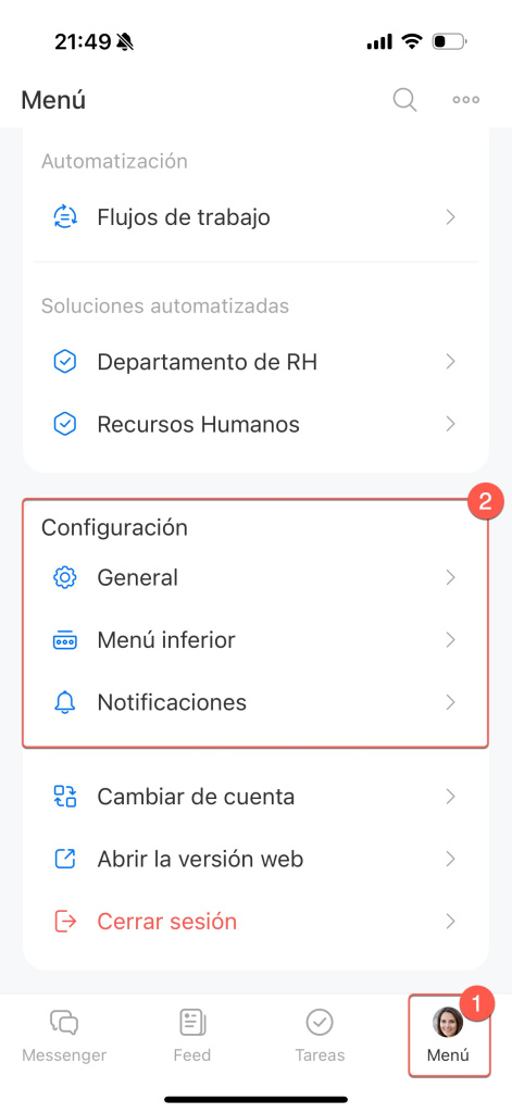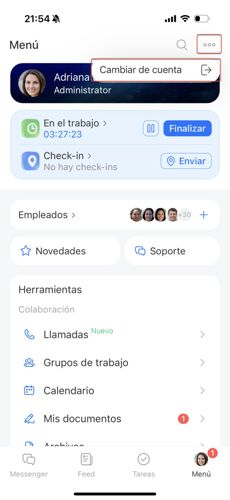 Todas las herramientas adicionales se encuentran ahora en un menú que se abre al pulsar tu avatar en la parte inferior de la pantalla. Desde aquí puedes gestionar tu tiempo de trabajo, registrar entrada, acceder a tu perfil, documentos y ajustes, y cambiar rápidamente entre cuentas.