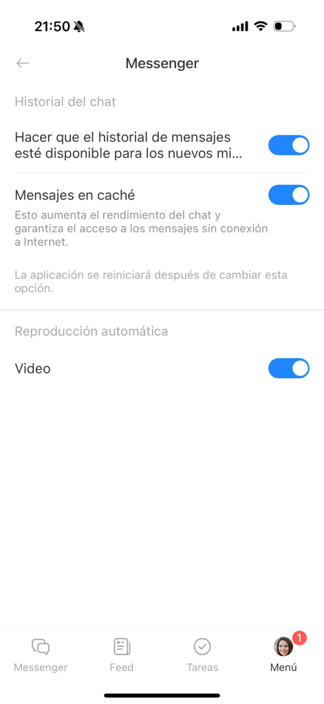 Ajustes generales. Cambia el tema de la aplicación, configura los chats, sincroniza contactos y calendarios, y selecciona el idioma.