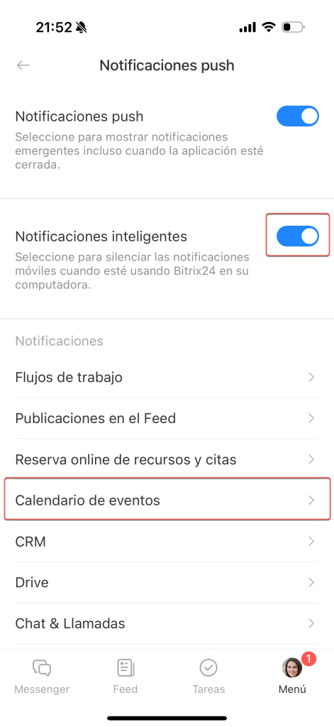 Notificaciones. Configura qué notificaciones deseas recibir. Activa el Notificaciones inteligentes para no recibir notificaciones en el móvil mientras trabajas en Bitrix24 desde tu computadora.