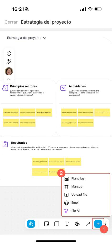 Puedes trabajar en los tableros igual que en la computadora: crear diagramas de flujo, añadir textos, emoticonos y notas adhesivas y mucho más.