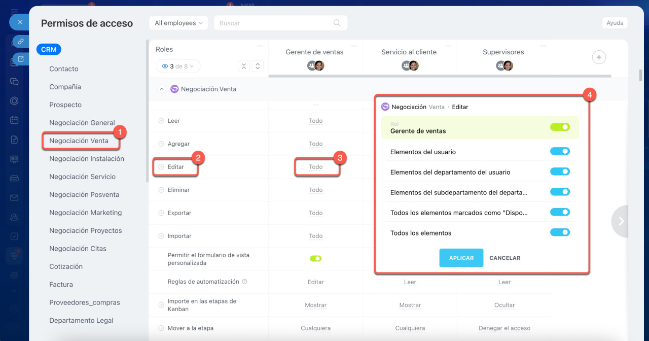 2. Otorga permisos al empleado para editar el elemento correspondiente del CRM. Por ejemplo, para procesar una llamada en una negociación, debe tener permisos para editar negociaciones.