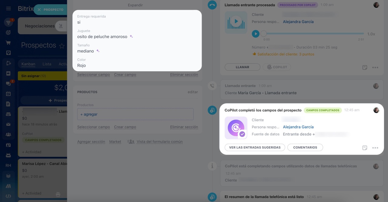 - En CRM de Bitrix24, está disponible CoPilot que es un asistente de inteligencia artificial. Ayuda a los gerentes a procesar llamadas y completa los campos en la ficha de CRM.