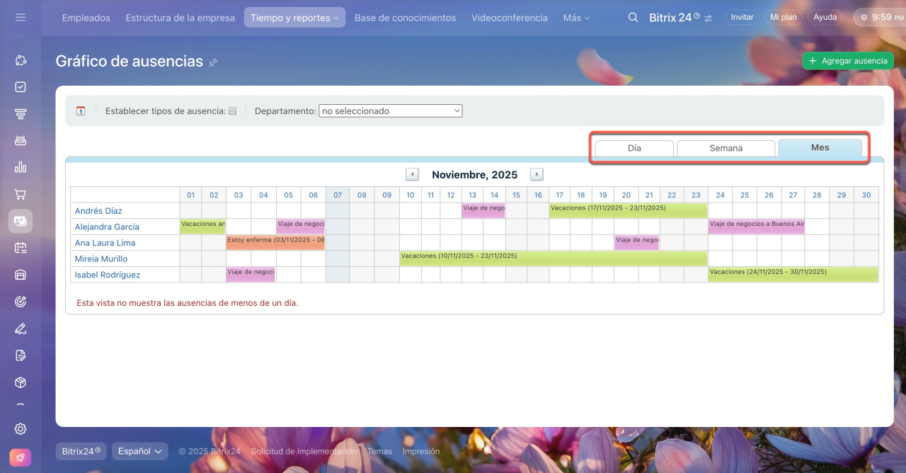• Para ver las ausencias del día actual, selecciona el período Día.