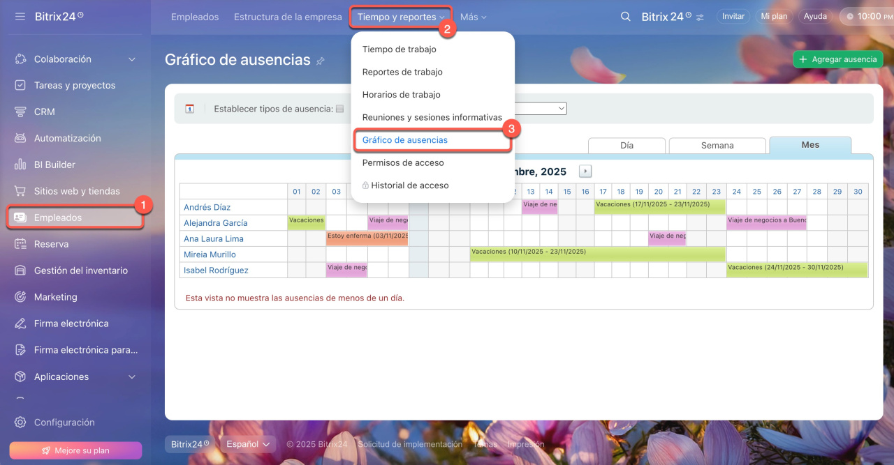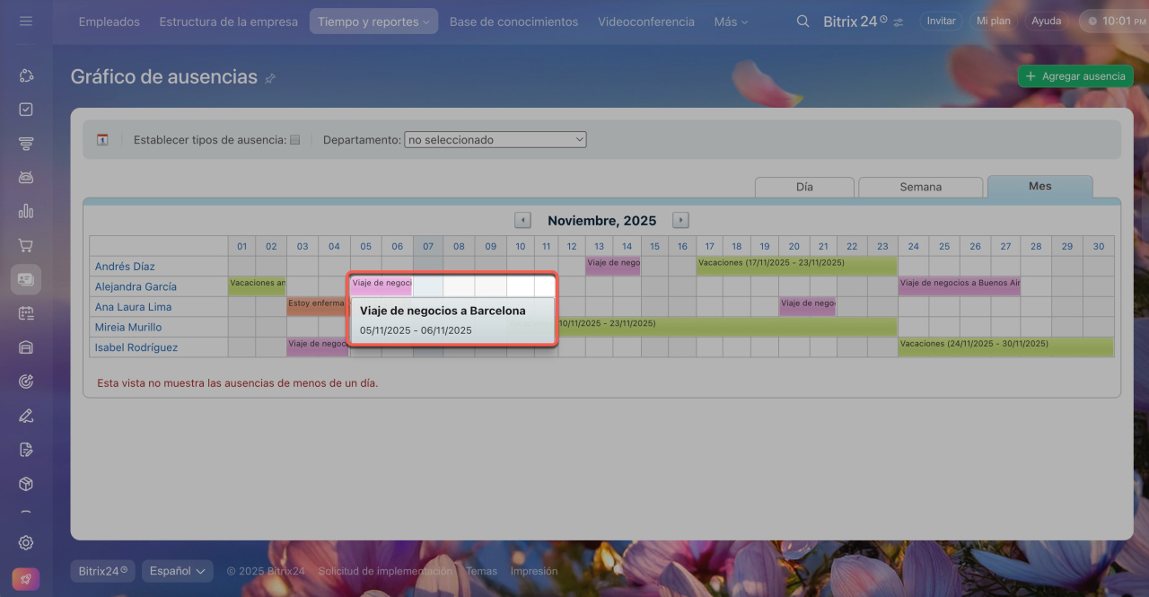 • El gráfico de ausencias muestra la disponibilidad de los empleados, lo que ayuda a organizar el flujo de trabajo y planificar las tareas.